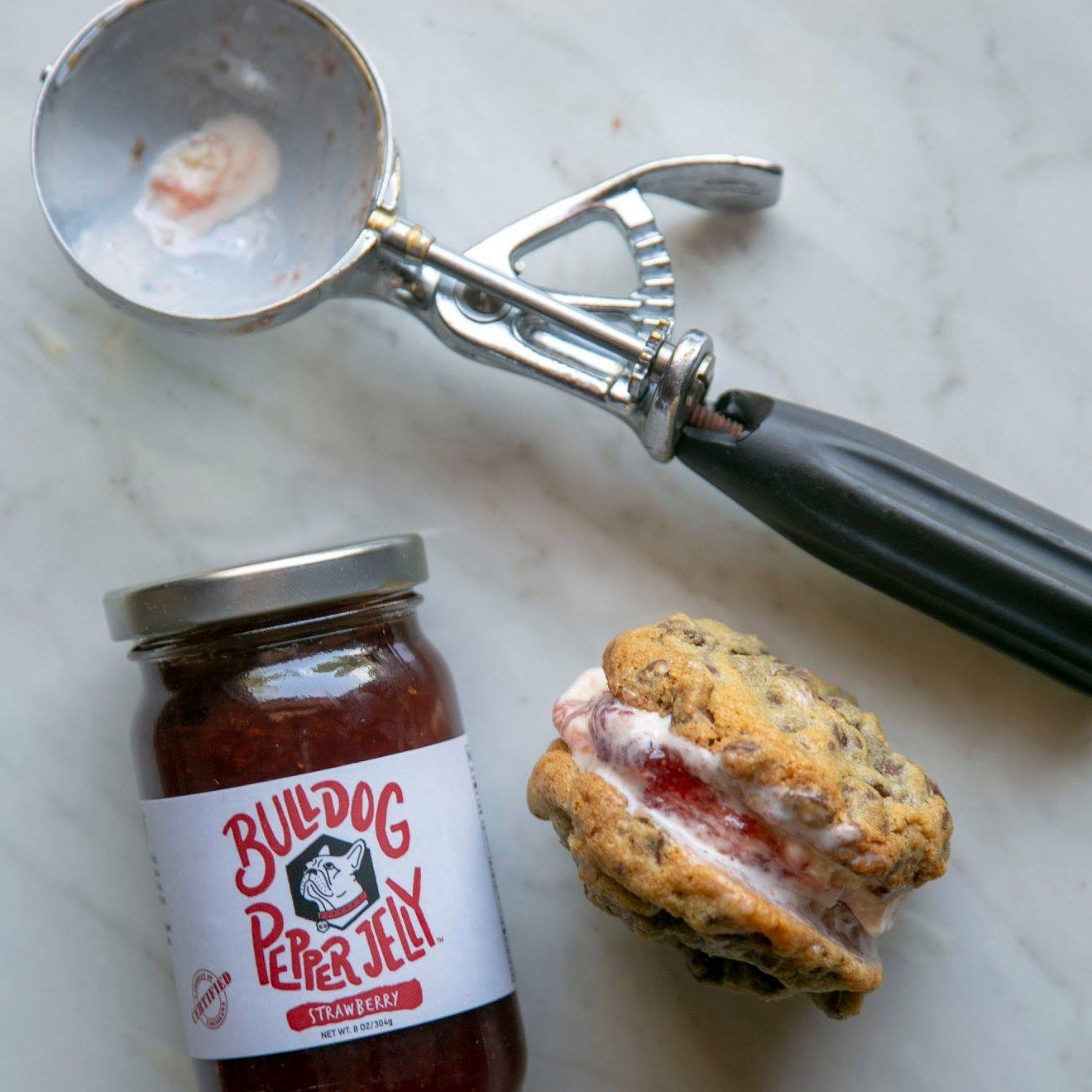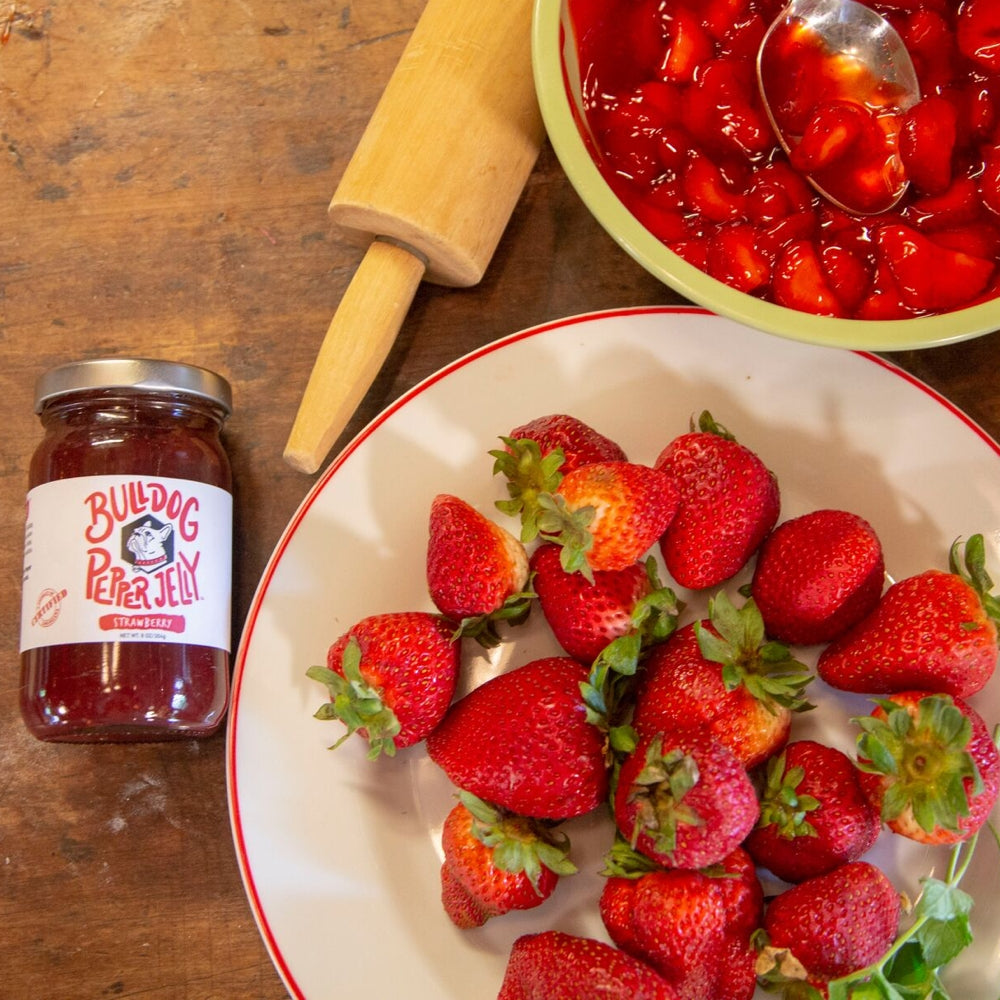 Strawberry Bulldog Pepper Jelly is made with freshly harvested strawberries, which makes for a beautiful texture and rich taste experience. Ripe with flavor from the fruit at first bite, and followed with the heat of the peppers, it’s the definition of spicy and sweet. This flavor adds the finishing touch to breakfast sandwiches, charcuterie boards, and PB&J sandwiches.